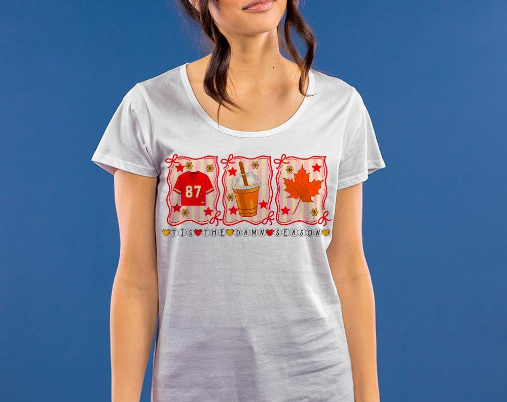🍁✨ ’Tis the damn season, babes! This cute and cozy digital design is serving all the fall vibes — football, PSLs, and crunchy leaves. The artwork features three fun panels: a bold red jersey with “87,” a pumpkin spice iced latte with cinnamon stick (because duh), and a classic autumn maple leaf. Wrapped up with stars, bows, and flowers on a candy-striped background, it’s basically fall perfection.