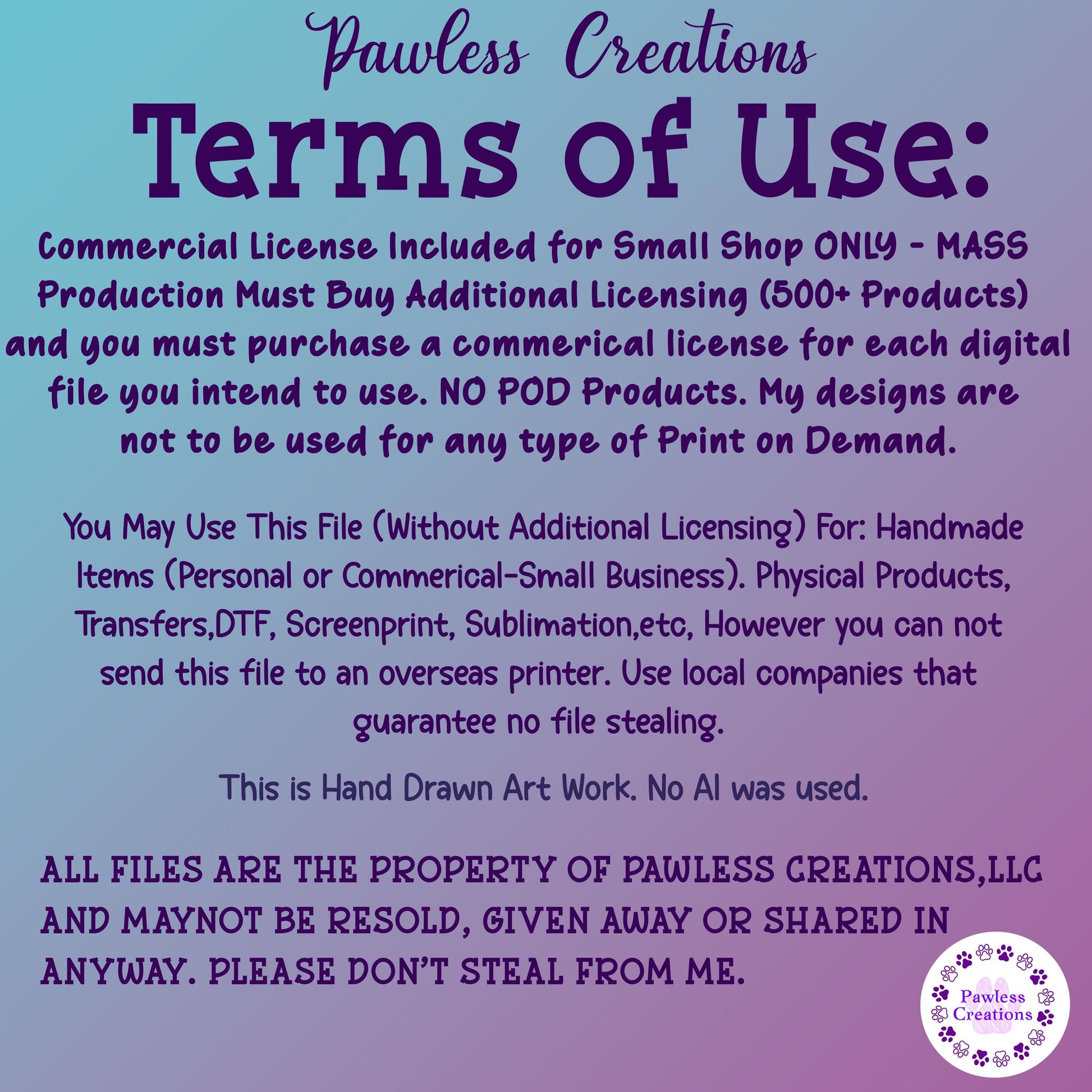 Copyright © 2025 Pawless Creations, LLC Purchasing digital items from this shop does not in any way transfer rights or ownership to the buyer. Furthermore, by purchasing any digital items from this shop you agree to any and all terms found on my shop page along with all terms and conditions stated above.