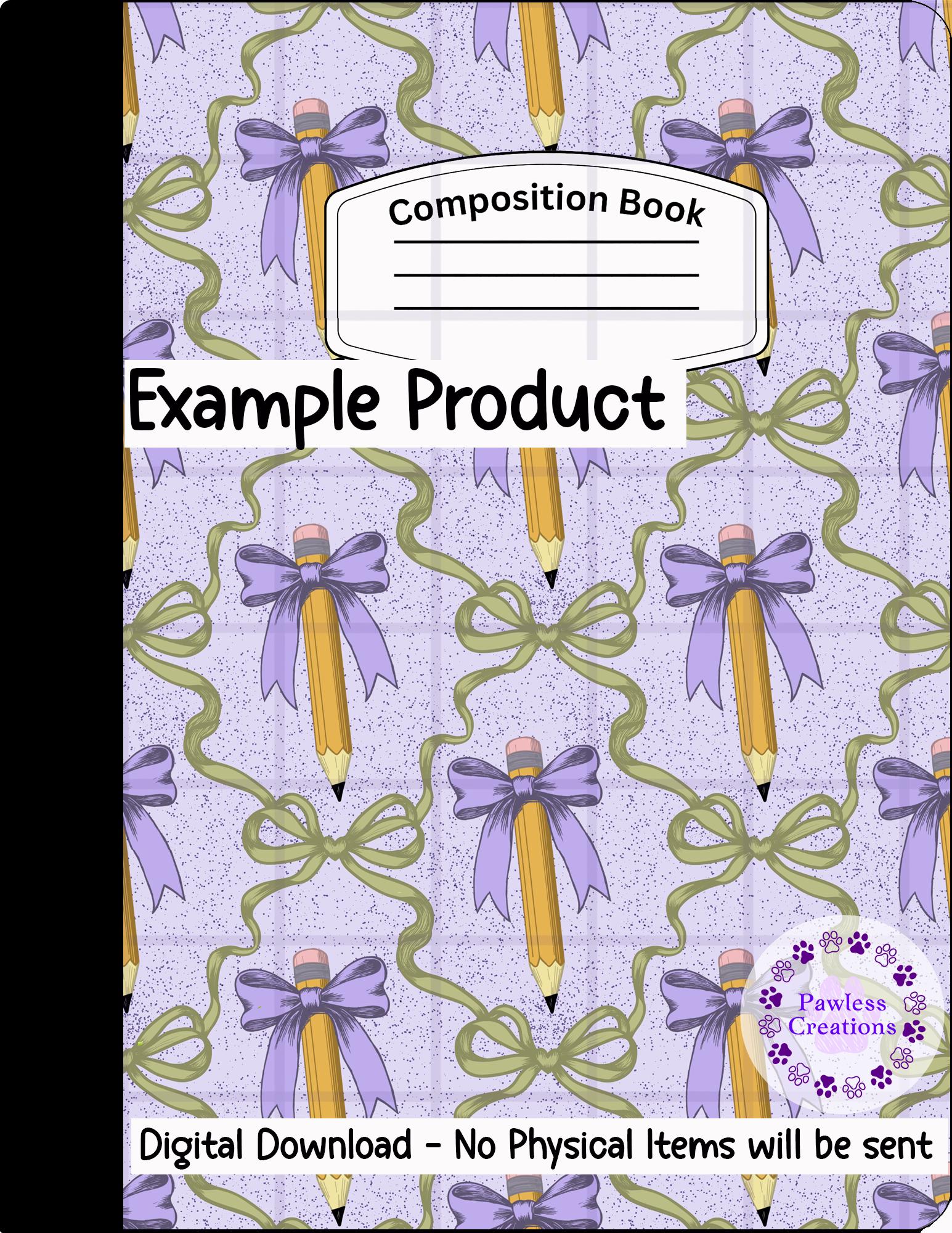 Printable Composition Notebook Cover: Purple Pencils & Bows PNG (6.9x10 in)